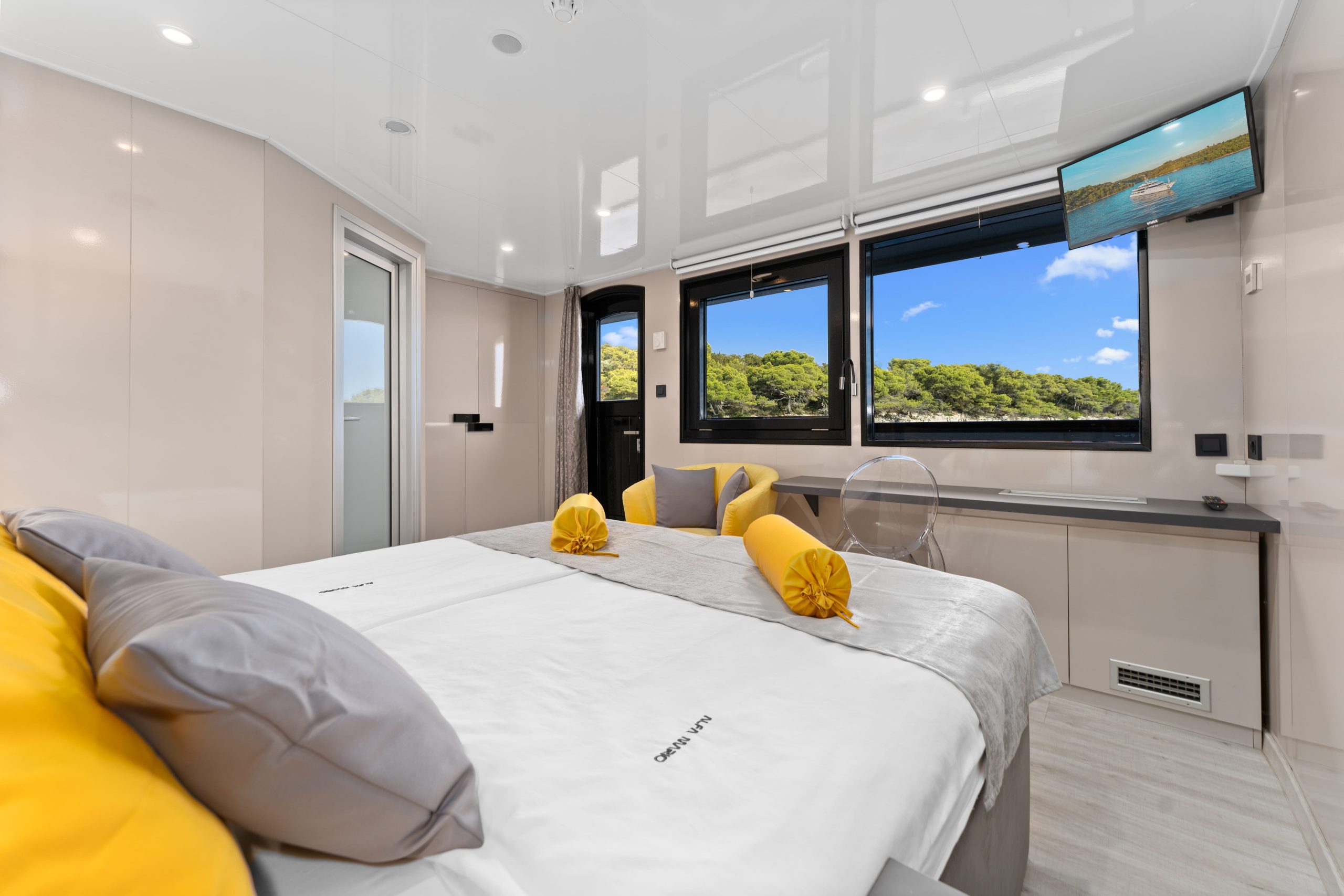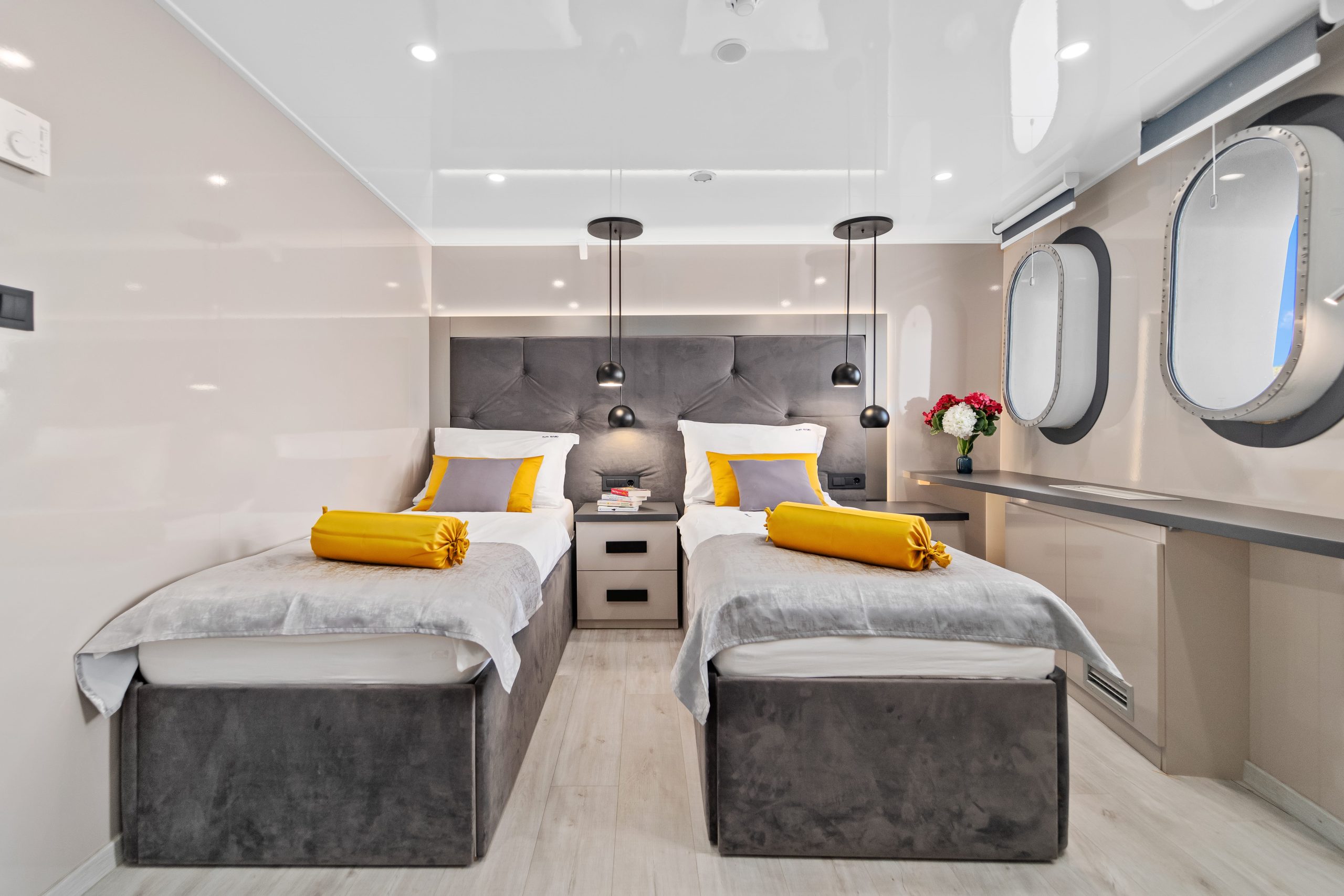 16 cabins for up to 32 guests, designed for comfort and easy living on board. The layout includes a Master cabin, VIP cabin, double cabins, and convertible cabins, all with ensuite bathrooms. The two top cabins also feature a bathtub in the cabin for extra comfort.